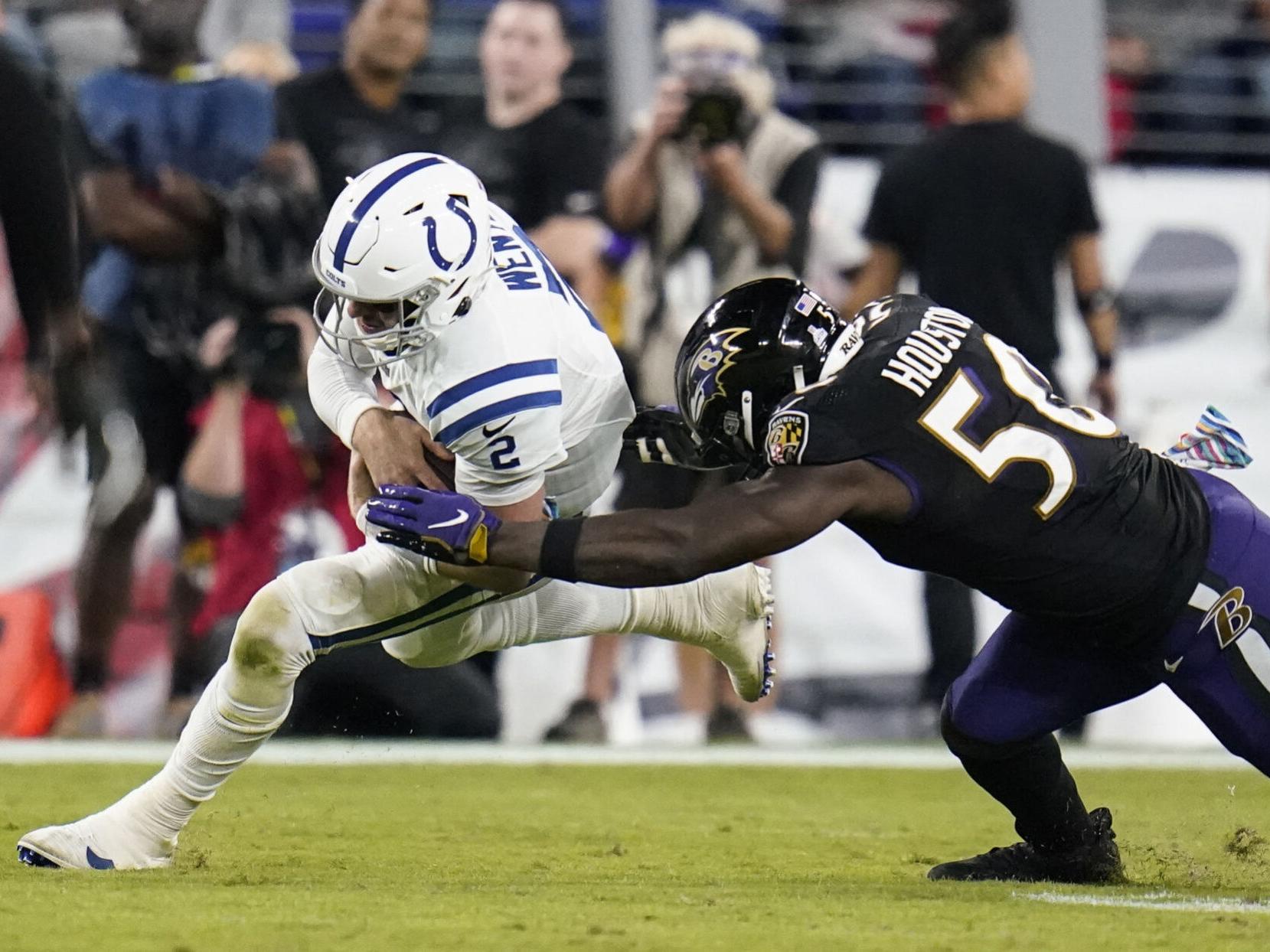 Ravens streak of 100-yard rushing games ends at 43 vs. Colts tied with 1974-77 Steelers for all-time record Federal prosecutors seek to continue detaining Annapolis couple charged with selling. Wentz is brought down by Ravens rookie Odafe Oweh and he forces a fumble.